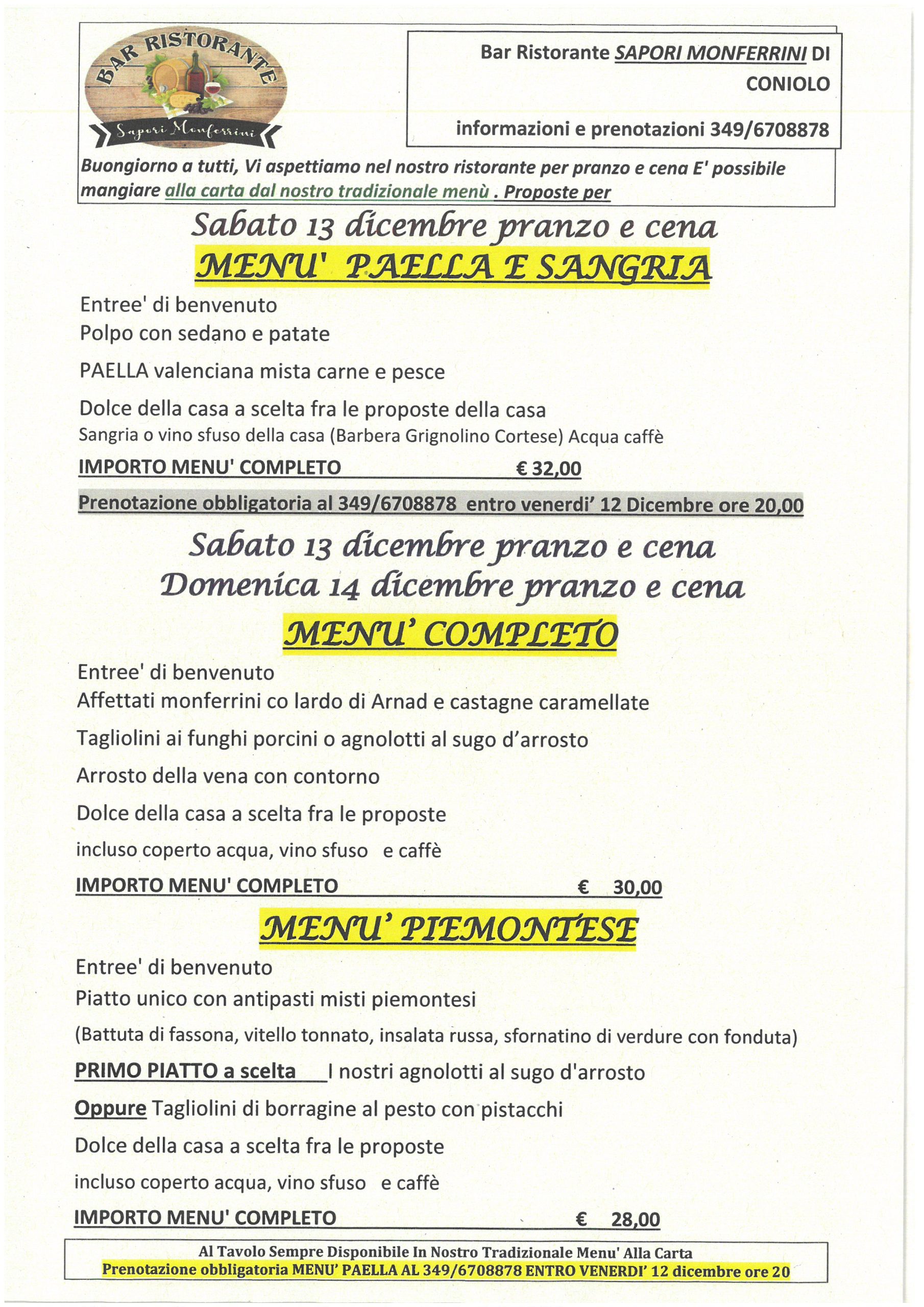SABATO 13 DICEMBRE MENU’ PAELLA E SANGRIA!! ALTRI MENU’ PROPOSTI PER SABATO 13 E DOMENICA 14 DICEMBRE